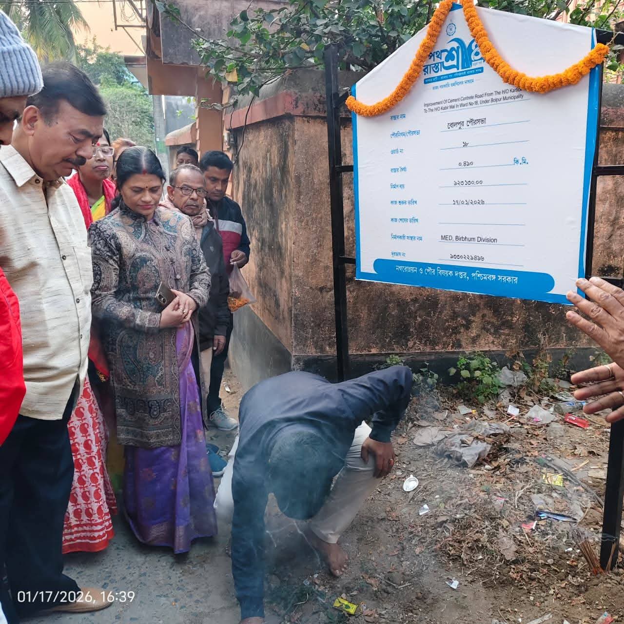 মাননীয়া মুখ্যমন্ত্রী মমতা বন্দ্যোপাধ্যায়ের সমাজমুখী প্রকল্প পথশ্রী 4 এর অন্তর্গত বোলপুর পৌরসভার ১৮ নম্বর ওয়ার্ডের রাস্তা সংস্কারের ভিত্তি প্রস্থর স্থাপন করা হল ৷ উপস্থিত ছিলেন মাননীয়া পৌরমাতা এবং ওয়ার্ড কাউন্সিলর ৷